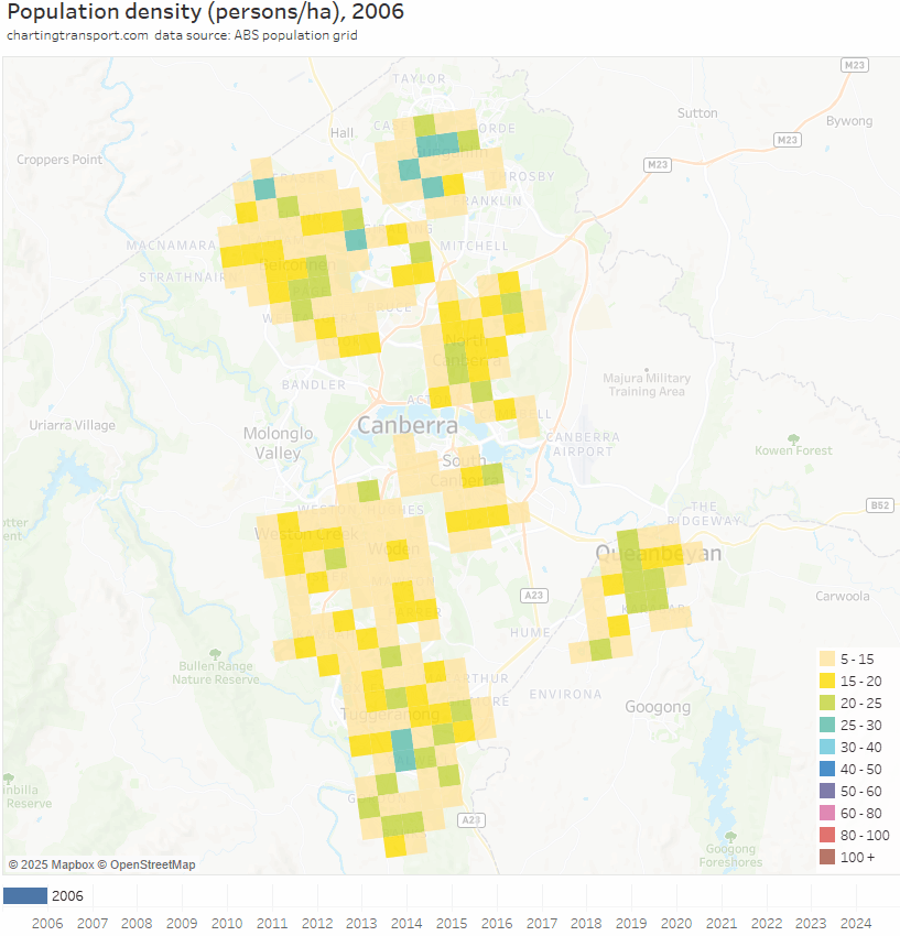 While I’ve contemplated clipping these non-urban areas from the Canberra population grid cells, there is a risk this would be inconsistent with other cities that also have many urban-non / urban interfaces, and I’d also probably be reliant on SA1 or SA2 geographies to define non-urban areas, which I know are not consistently drawn across all states and territories. There would also then be arguments that proximity to open space is important for residents so some of this open space should be included in the density calculation.