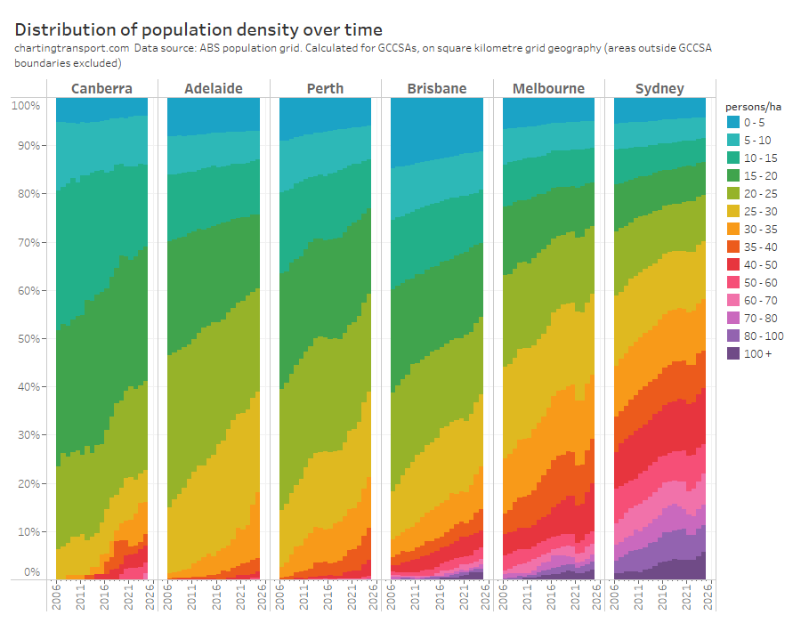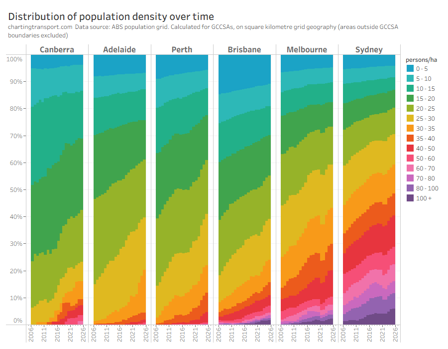 Note: I have recently refined calculations of density using population grid data to exclude areas outside greater capital city statistical area boundaries – including larger areas of water. This has increased calculated density values by different amounts for different cities. Refer appendix below for more details.