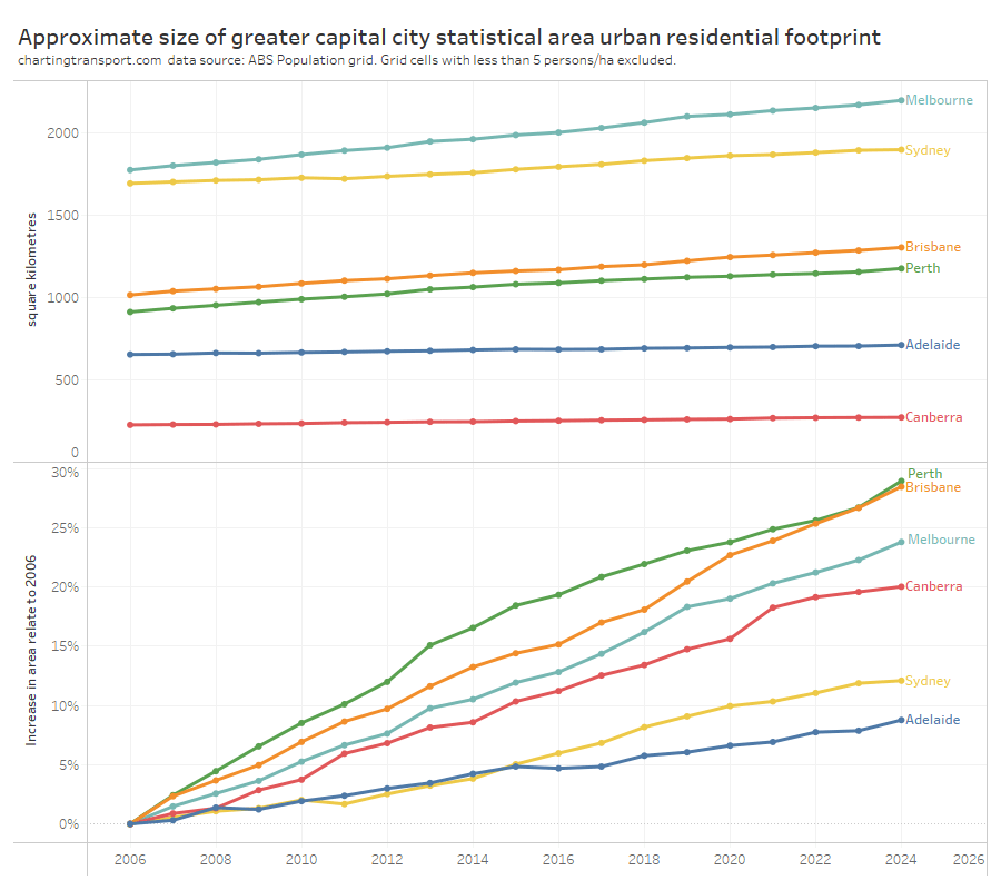 The bottom half of the chart shows that Perth and Brisbane have had the largest percentage growth in urban residential footprint since 2006, followed by Melbourne. Sydney and Adelaide have had the least growth in footprint, and are also seeing the least population growth in percentage terms.