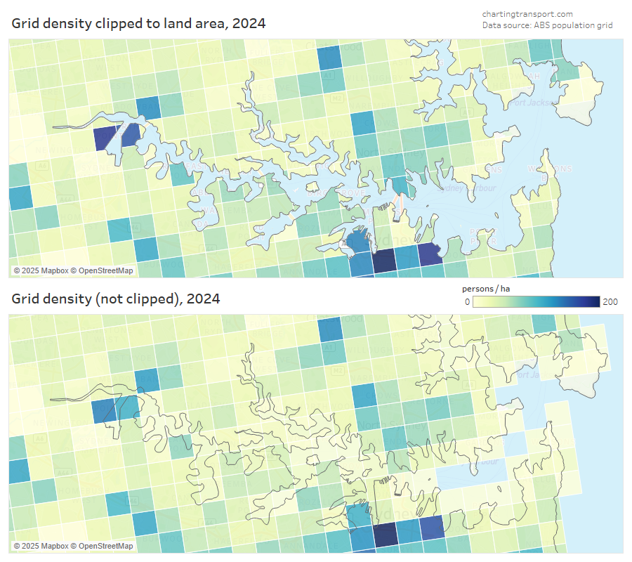 Many grid cells containing shorelines show relatively high density when clipped to the land area, and relatively low density when unclipped. For example the grid cell just east of North Sydney (mostly water) is 79 persons/ha when clipped, but only 24 persons/ha when unclipped.