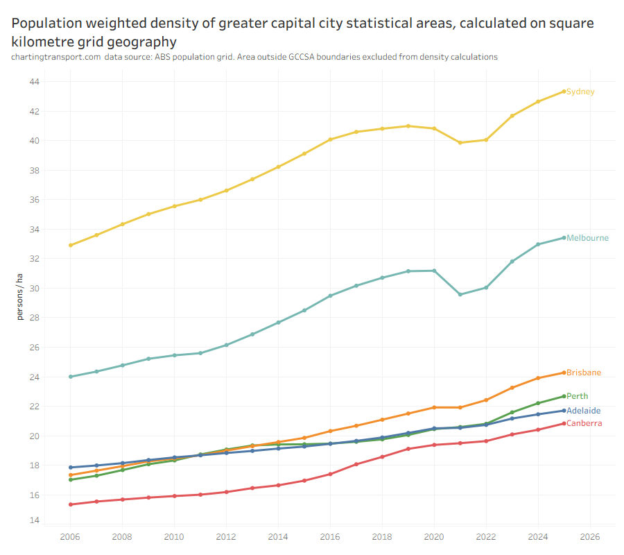Population weighted density here is calculated using the ABS square kilometre population grid, clipped by greater capital city statistical area boundaries. Hobart and Darwin are excluded because of small footprints. For more discussion on density measurement and deeper analysis see this post.
