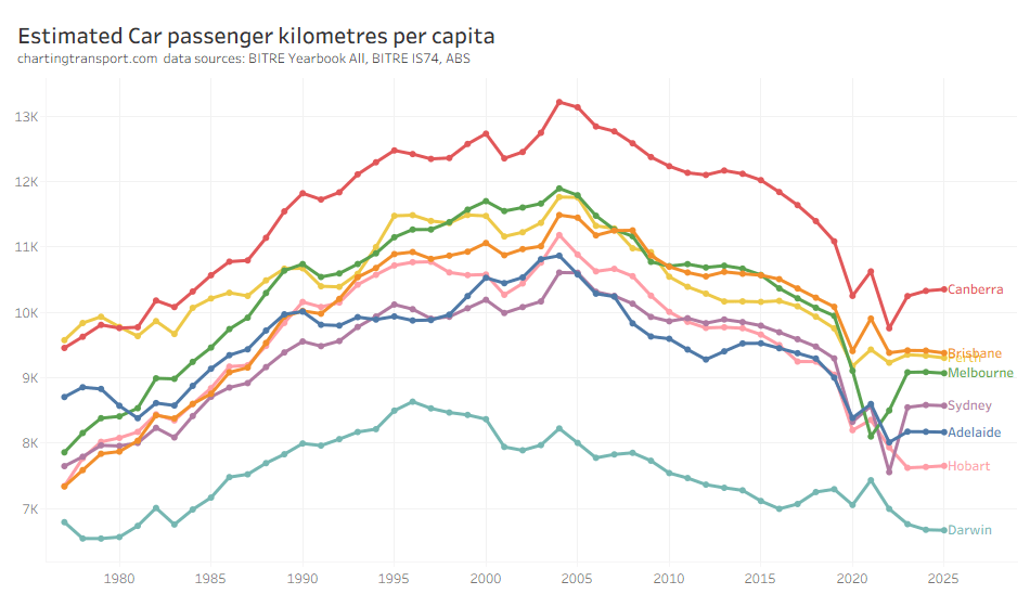Following the pandemic, car passenger kilometres per capita have bounced back in Sydney, Melbourne, and Canberra – however most cities had 2022-23 figures that were in line with a longer-term downward trend if you disregard the COVID years. Between 2022-23 and 2023-25, car passenger km per capita was pretty much unchanged in most cities according to the data.