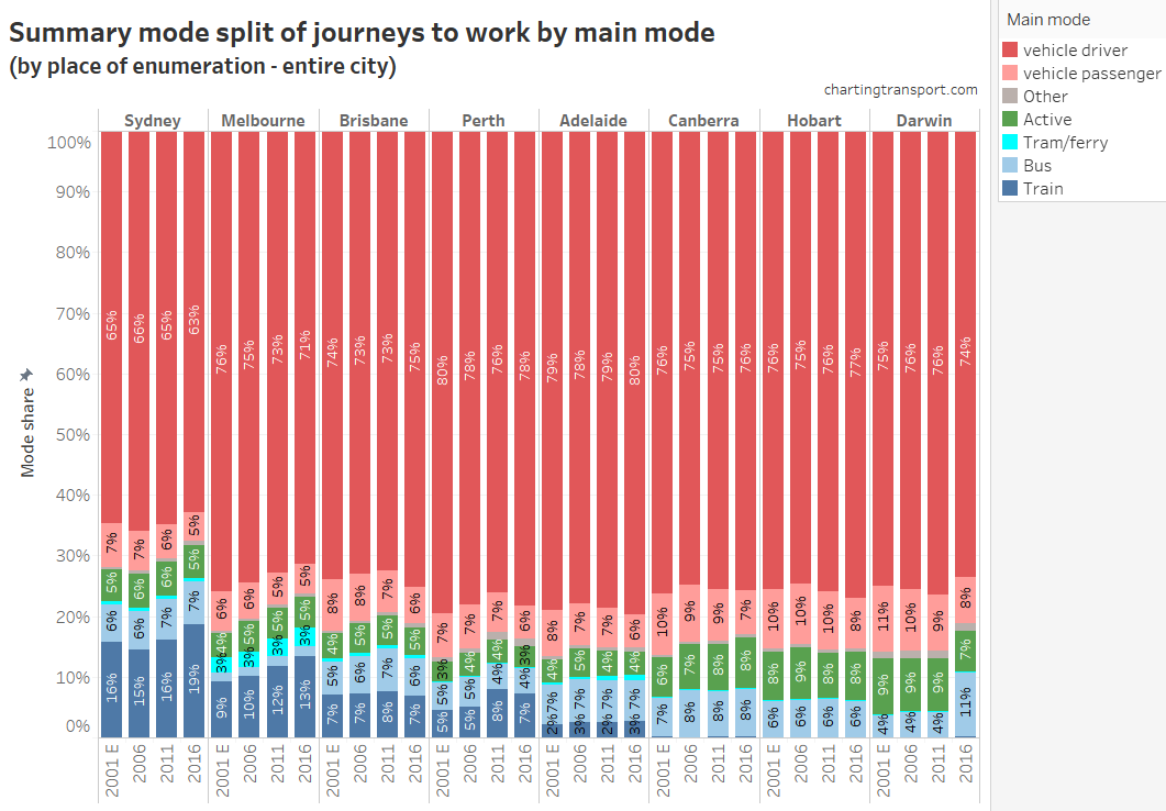 I have been looking at recent household travel survey data to calculate travel mode splits, but I am getting unexpected results that are quite different to BITRE estimates (especially Melbourne) and with unexpected trends over time (especially Brisbane), so I’m not comfortable to publish such analysis at this time.