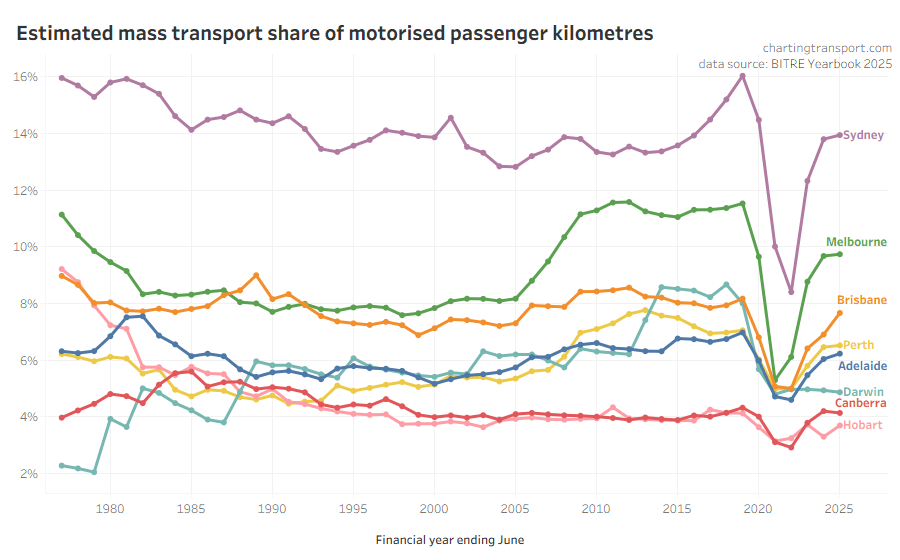 In the most recent financial year mass transit more share increased in all cities except Canberra and Darwin. Brisbane had a the biggest jump in mass transport mode share from 6.9% in 2023-24 to 7.7% in 2024-25, probably related to the introduction of 50 cent fares in August 2024.