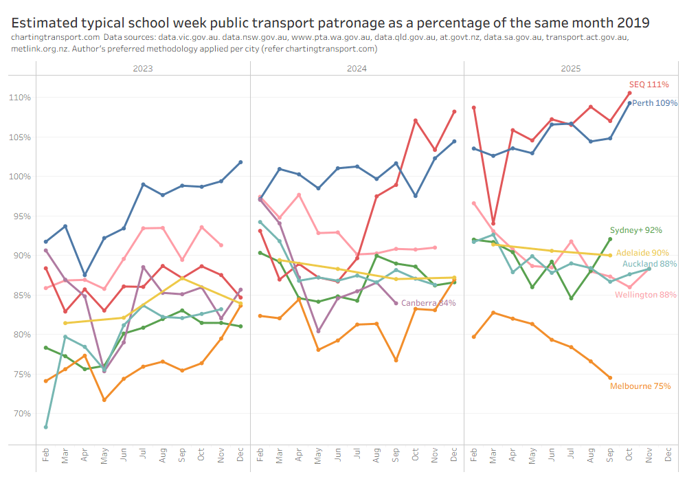 South East Queensland (SEQ) has overtaken Perth on patronage recovery relative to 2019, which is probably mostly a result of fares being slashed to 50 cents in August 2024.