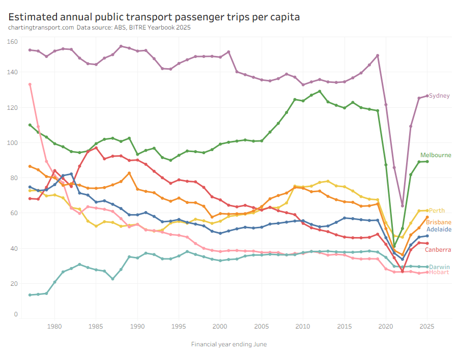 This chart produces some unexpected outliers. Hobart shows up with very high public transport trips per capita in the 1970s, which might be relate to the Tasman Bridge Disaster which severed the bridge between 1975 and 1977 and resulted in significant ferry traffic for a few years (over 7 millions trips in 1976-77).