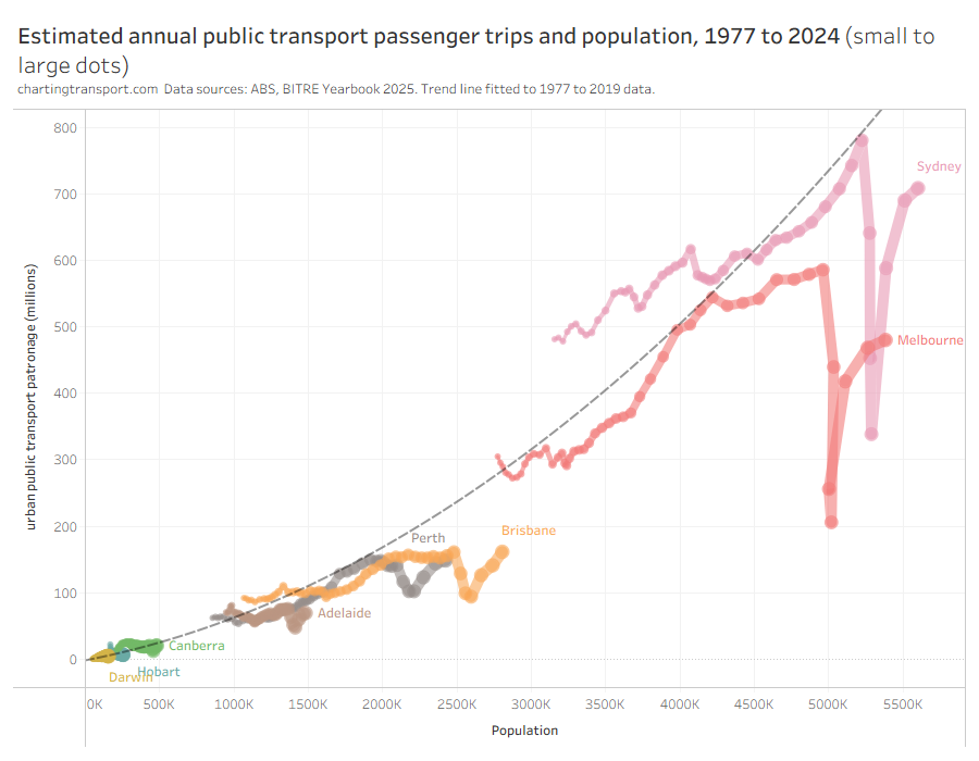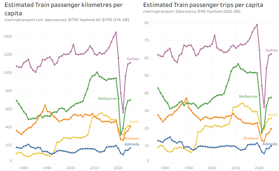 All cities are bouncing back after the pandemic, with Perth the strongest (likely related to some major new rail network extensions opening). I’m not quite sure why Adelaide saw such large growth in 2024-25.
