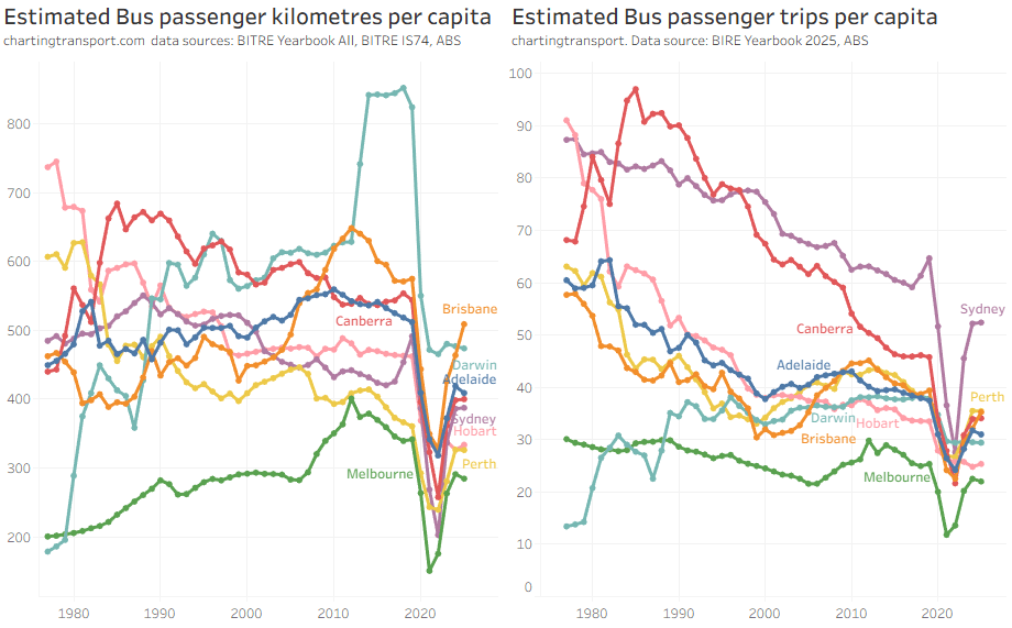 In most cities passengers trips per capita has bounced back strongly since the pandemic (except Darwin and Hobart), but to lower levels than 2019.