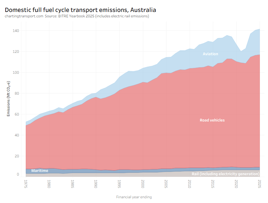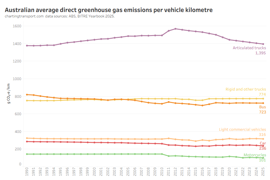 I’m not sure why aviation emissions per passenger km declined substantially from 2017 to 2019 – perhaps there was some shift to newer more efficient fleet, but I cannot identify significant fleet changes in Qantas or Virgin Australia. Since the pandemic, emissions per passenger km has bounced back to the higher ~2017 levels since the pandemic, so this efficiency gain appears to have been lost.