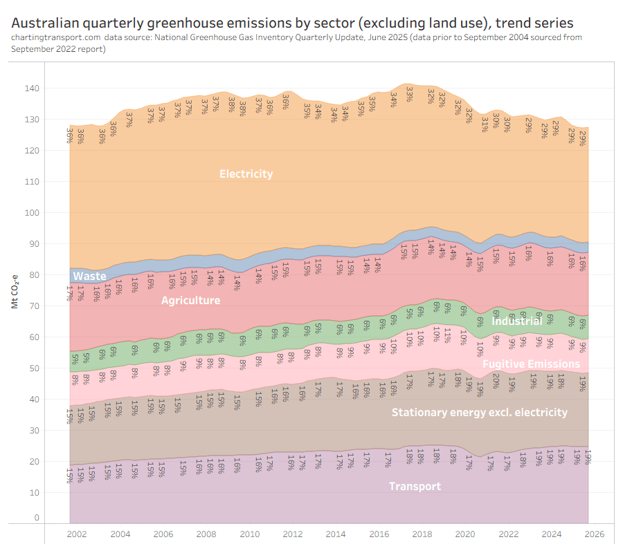 Australia’s greenhouse gas emissions (excluding land use) at September 2025 were only slightly below those at September 2001, and transport’s share has risen from 15% in 2001 to 19% in 2025.