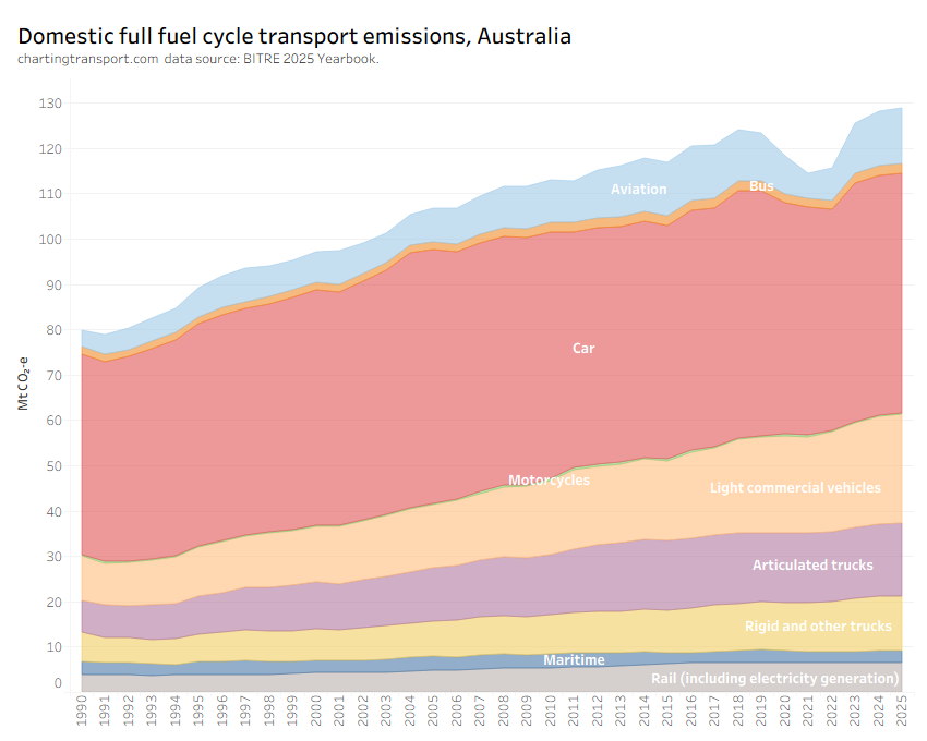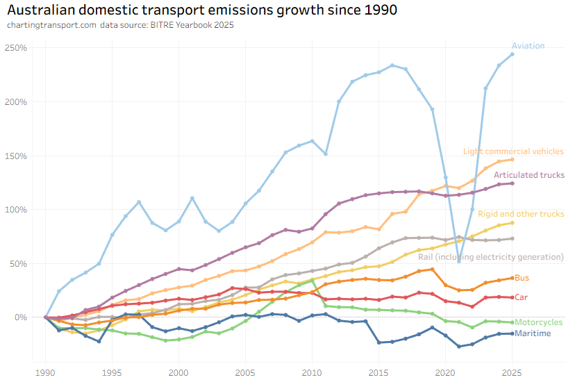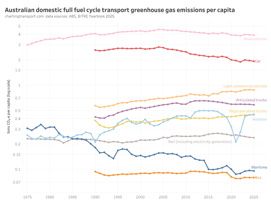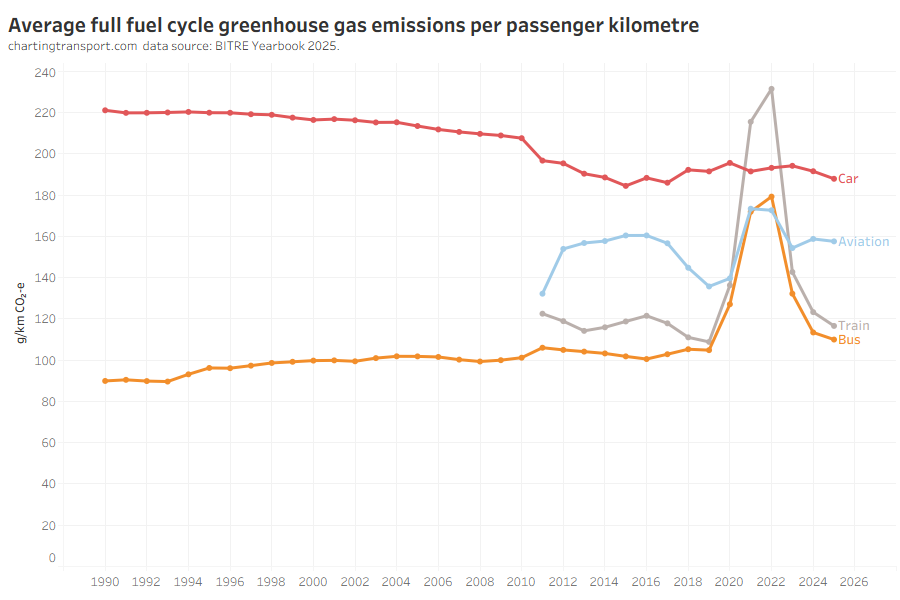I’m not sure why aviation emissions per passenger km declined substantially from 2017 to 2019 – perhaps there was some shift to newer more efficient fleet, but I cannot identify significant fleet changes in Qantas or Virgin Australia. Since the pandemic, emissions per passenger km has bounced back to the higher ~2017 levels since the pandemic, so this efficiency gain appears to have been lost.