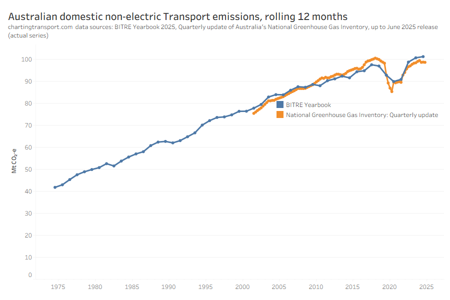 BITRE has transport emissions hitting a new high in 2024-25, while the the National Greenhouse Gat Inventory quarterly update has transport emissions peaking in calendar 2018.