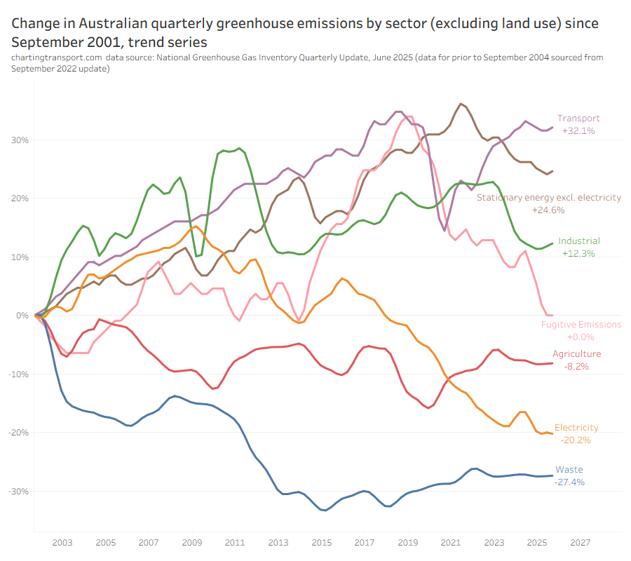 Australia’s greenhouse gas emissions (excluding land use) at September 2025 were only slightly below those at September 2001, and transport’s share has risen from 15% in 2001 to 19% in 2025.