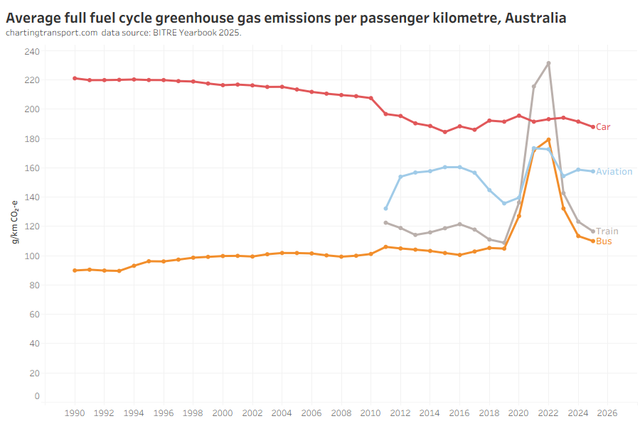 During the pandemic years the emissions per passenger km increased for buses, trains, and aviation as passenger load factors no doubt plummeted, but have returned to pre-pandemic levels.