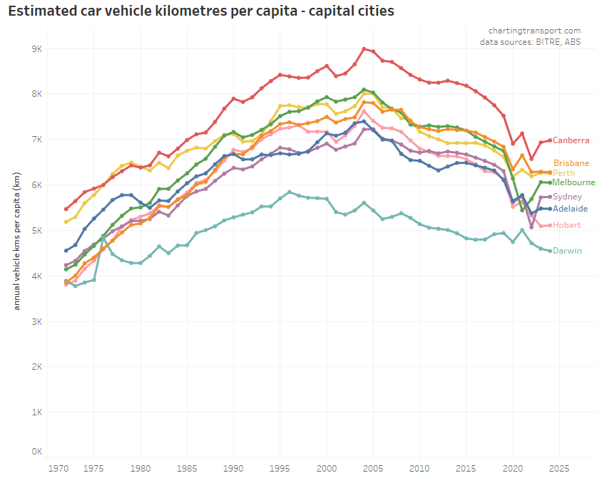 Canberra has dramatically reduced vehicle kilometres per capita since around 2014 leaving Brisbane as the top city (it’s not clear to me why this is the case).