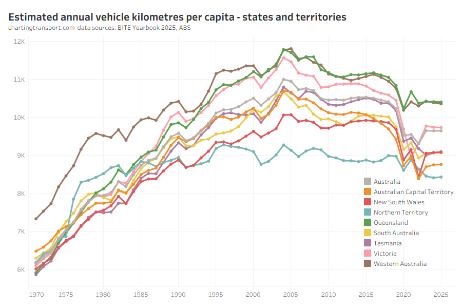 Vehicle kilometres per capita peaked around 2004-05 and were starting to flatline in some states before the pandemic hit with obvious impacts. In 2024-25 vehicle kilometres per capita was pretty stable in all states and territories, at lower than pre-pandemic levels.