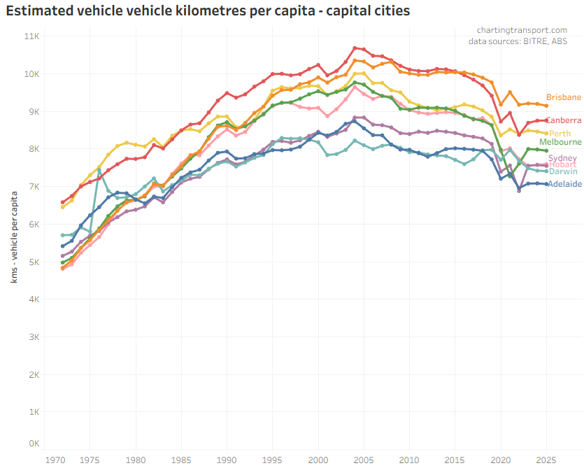 Canberra has dramatically reduced vehicle kilometres per capita since around 2014 leaving Brisbane as the top city (it’s not clear to me why this is the case).